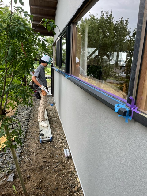 マスキングテープで養生し ガルバニウム鋼板と窓の間をシーリングします。