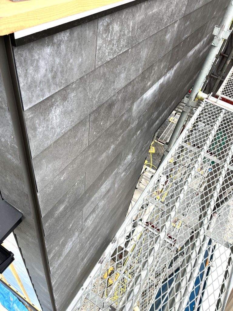 玄関上 部分に灰色のケイミューソリド施工中です