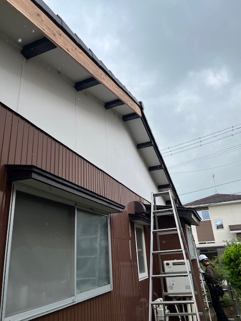 木の破風、桁が傷んでいるので厚み25幅180の木板を打ち付け0.35JFEジェットブラックの平板で板金破風を加工し取り付けました。